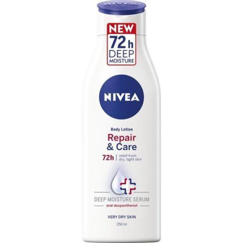 Nivea Repair & Care Body Lotion berfungsi melalui gabungan bahan pelembap yang berkuasa seperti Deep Moisture Serum dan Dexpanthenol untuk menguatkan penghalang kelembapan kulit dari dalam. Ia menenangkan kawasan yang teriritasi dan melembapkan kulit secara mendalam untuk melindunginya daripada kekeringan lanjut selama sehingga 72 jam.